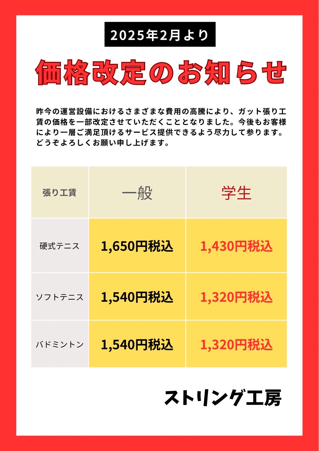 ガット張替え工賃変更のお知らせ 2025 1/30 未分類 2025年1月30日 未分類 お知らせ ストリング工房 ソフトテニス テニス バドミントン 関連記事 ガット張り工賃価格改定のご案内 2026年1月29日 新春おみくじ2026 2025年12月31日 2025-2026年末年始大セール 2025年12月23日 技術講習会のご案内 2025年11月26日 11月3日イベント大抽選会結果発表 2025年11月12日 11/3張替えについてのご案内 2025年10月29日 11月2日、3日営業時間変更のお知らせ 2025年10月25日 11月3日イベント時大抽選会開催! 2025年10月25日